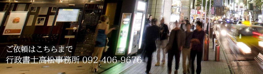 福岡・博多の風俗営業許可申請 行政書士高松事務所 〒810-0024 福岡市中央区桜坂3丁目12番92-208号 電話番号092-406-9676 | お気軽にお問い合わせください 平日9:00~18:00(土曜12:00) お急ぎのときは090-8830-2060 |